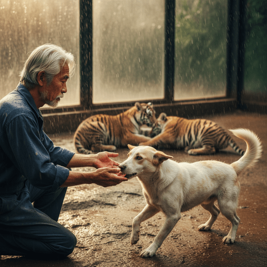 Zachary ingresó nuevamente al área donde se encontraban los felinos. Daisy, la perra que había criado a los tres cachorros de tigre, se abalanzó hacia él con entusiasmo mientras sus crías jugueteaban detrás. Una mezcla de emociones invadió su pecho cuando se inclinó para tocar a su antigua compañera. Ella respondió con lamidas en su mano y movimientos alegres de cola. En ese momento, solo pudo susurrar palabras que sabía ella jamás comprendería.